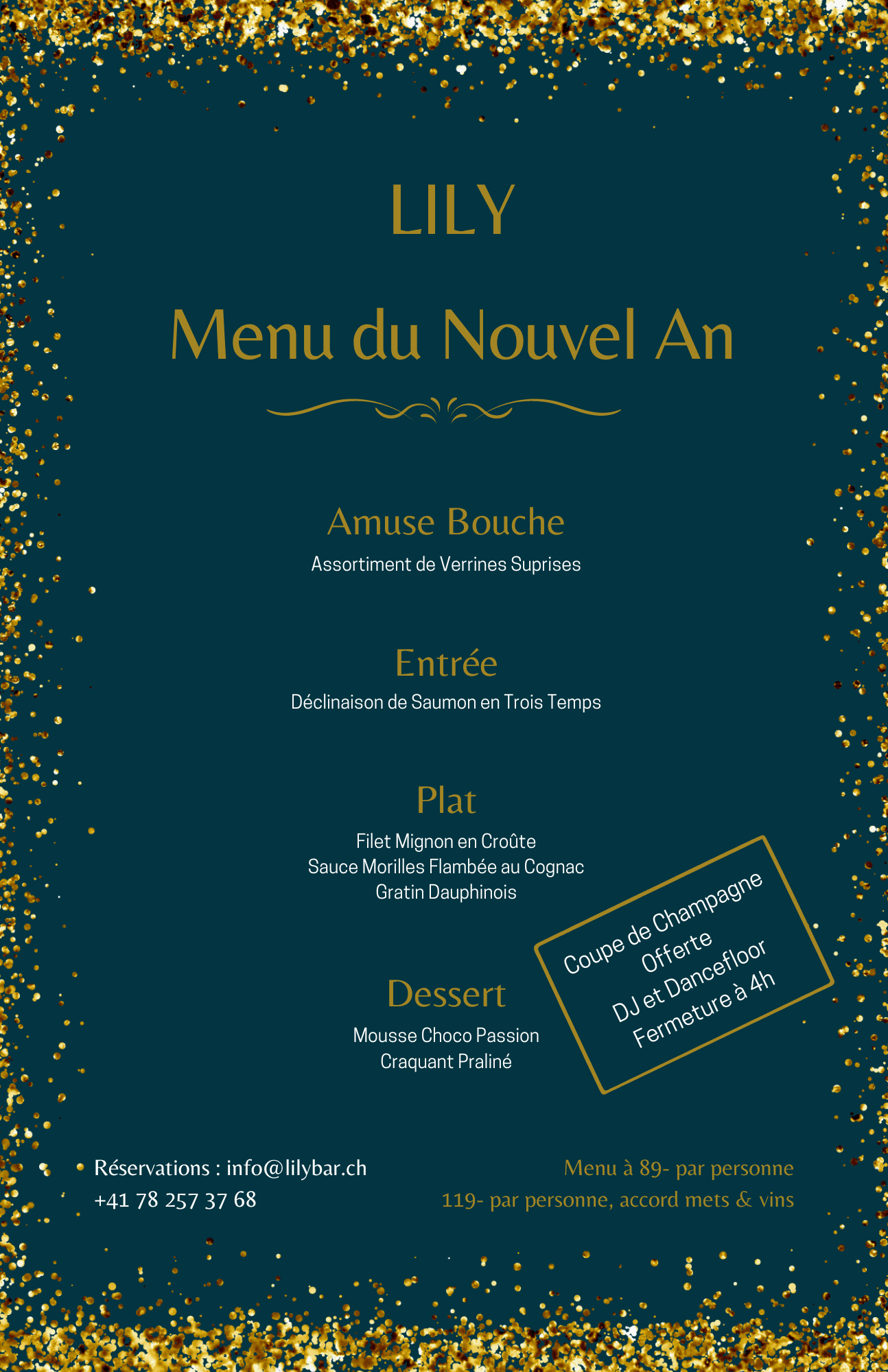 Venez célébrer la nouvelle année à Lily! Au Programme : Réservation par e-mail ou téléphone (078 257 37 68) Vous souhaitez venir que pour la partie dansante? Aucun problème mais écrivez-nous un petit WhatsApp ou appelez nous pour qu'on vous réserve une table!