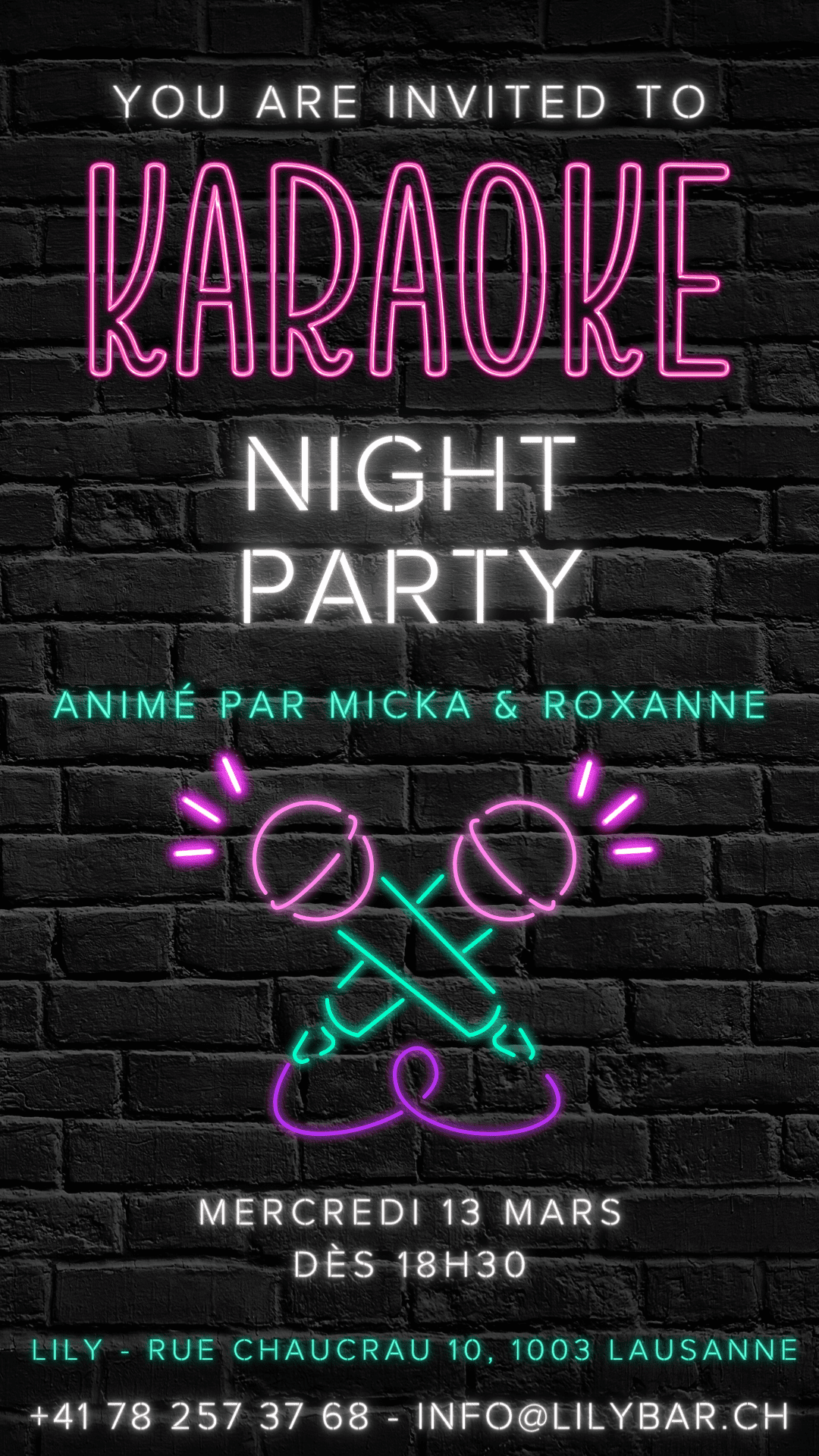 Devenez une star de la chanson le temps d'une soirée! Lily organise son premier karaoké mercredi 13 mars, animé par deux passionnés : Michael & Roxana. Ils vous feront passer une soirée inoubliable !! N'oubliez pas de réserver via What's app/sms au 078 257 37 68 ou par email à info@lilybar.ch