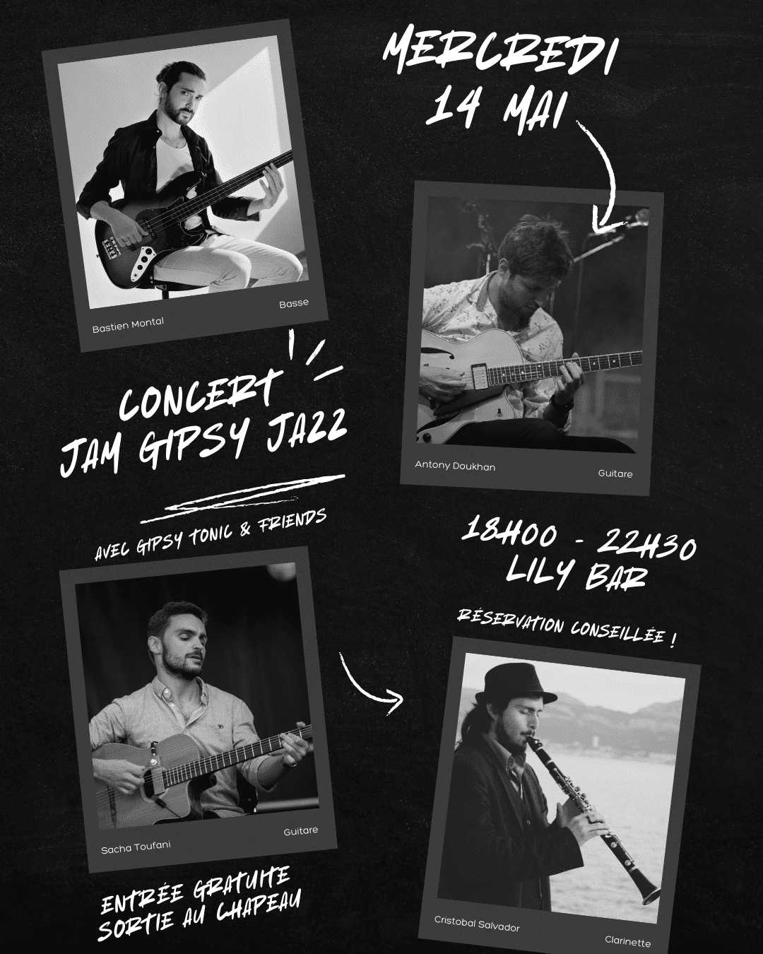 Les beaux jours arrivent et c'est le retour des concerts jam du Lily! On te donne RDV mercredi 14 mai pour le concert des Gipsy Tonic, suivi de la Jam animé par eux! Prends ton instru et rejoins les artistes sur scène! Entrée gratuite, sortie au chapeau